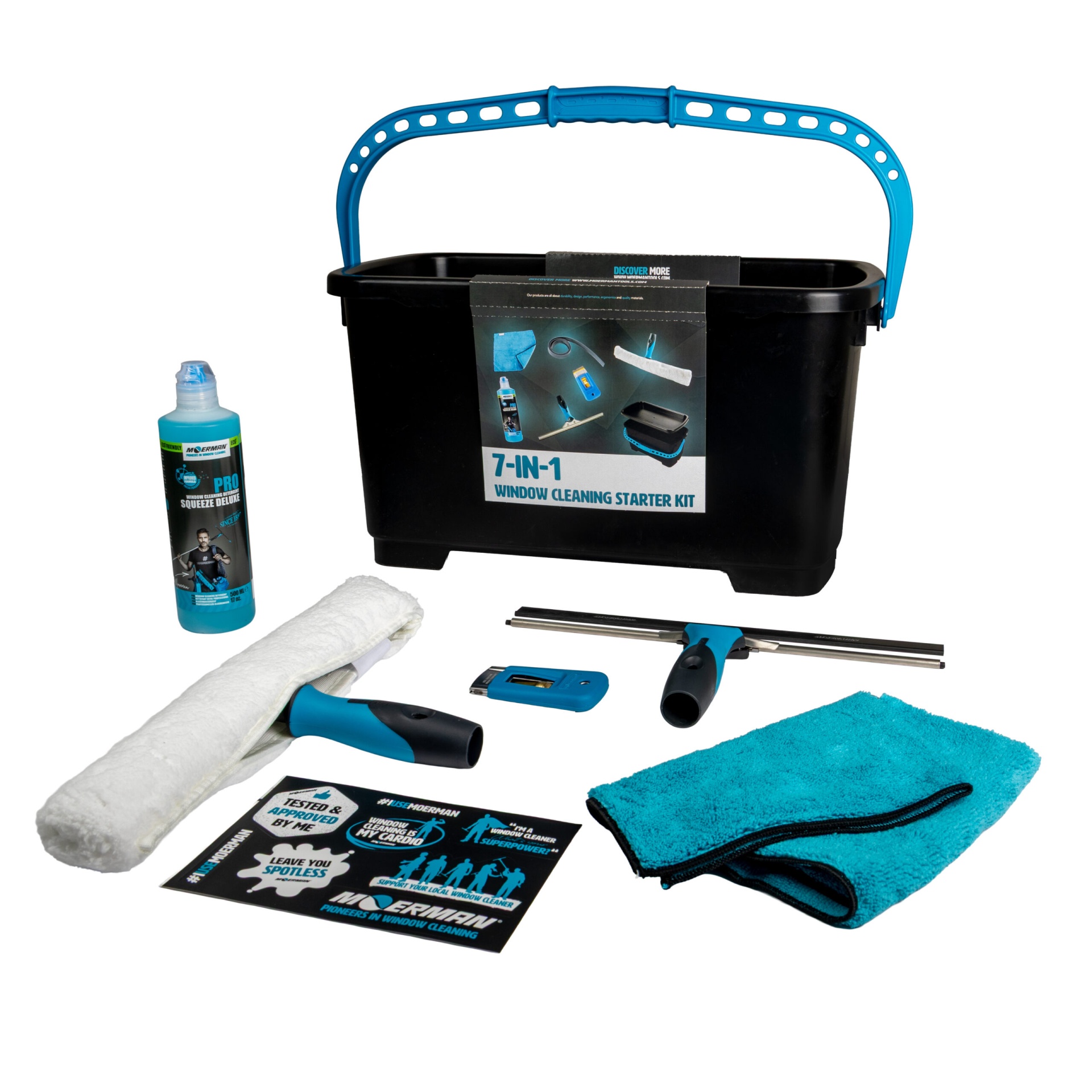 Procura um kit completo e fiável para começar a limpar janelas profissionalmente? O kit inicial para limpeza de janelas 7 em 1 da Moerman foi cuidadosamente concebido para equipar tanto os limpadores de janelas novatos como os experientes com todos os elementos essenciais — desde o primeiro dia. Foi concebido para o ajudar a limpar mais rapidamente, melhor e com resultados visíveis.